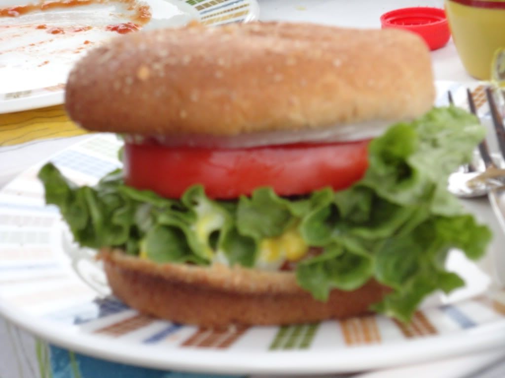 To serve, spread mayonnaise mixture on bun. Assemble burger with lettuce, onion and tomato. Enjoy without guilt!